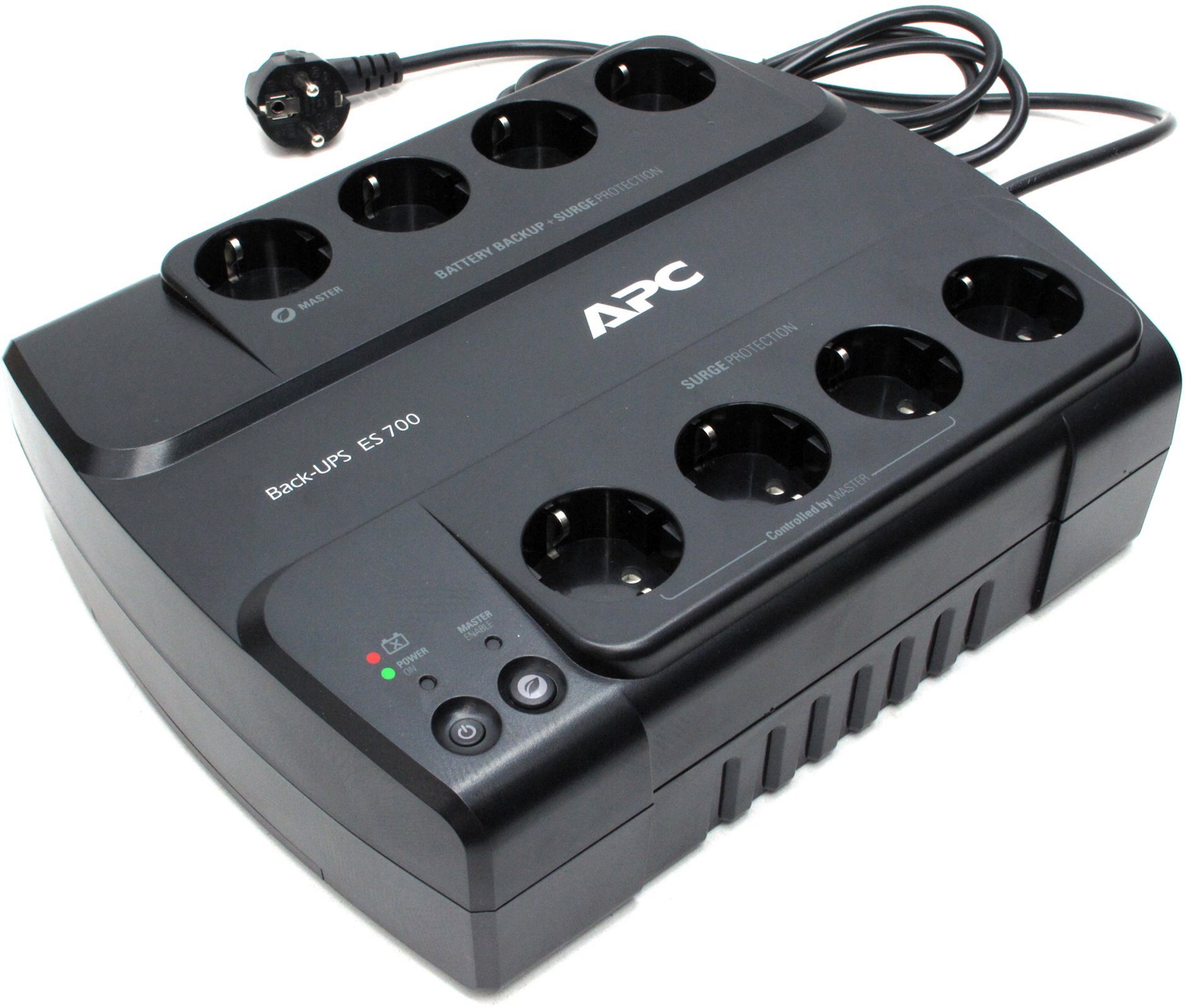 APC Back-UPS ES 700VA работает в диапазоне входного напряжения от 180 до 266 В. ИБП оснащен 8 евророзетками, которые осуществляют защиту устройств от перенапряжения. Четыре из восьми розеток выполняют бесперебойное питание. Общее время зарядки модели – 16 часов. При полной нагрузке ИБП работает 3,7 минут, а при половинной – 15,1 минут. Разъемы для RJ-11 или RJ-45 расположены на тыльной стороне этого устройства. Переменный резистор, встроенный в модель, может рассеивать энергию импульса до 310 Дж без угрозы разрушения своей целостности.