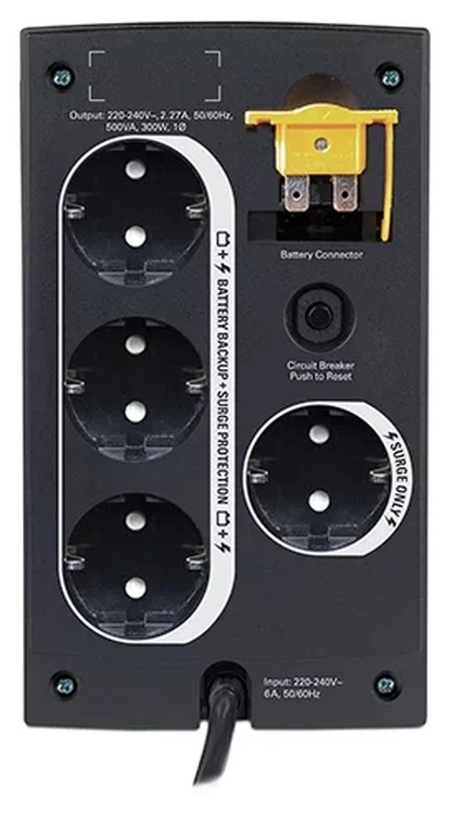 мощность (полная): 500 ВА, выходная мощность (активная): 300 Вт, тип выходных разъемов питания: CEE 7 (евророзетка), Количество выходных разъемов питания (UPS): 3, количество выходных разъемов питания (общее): 4