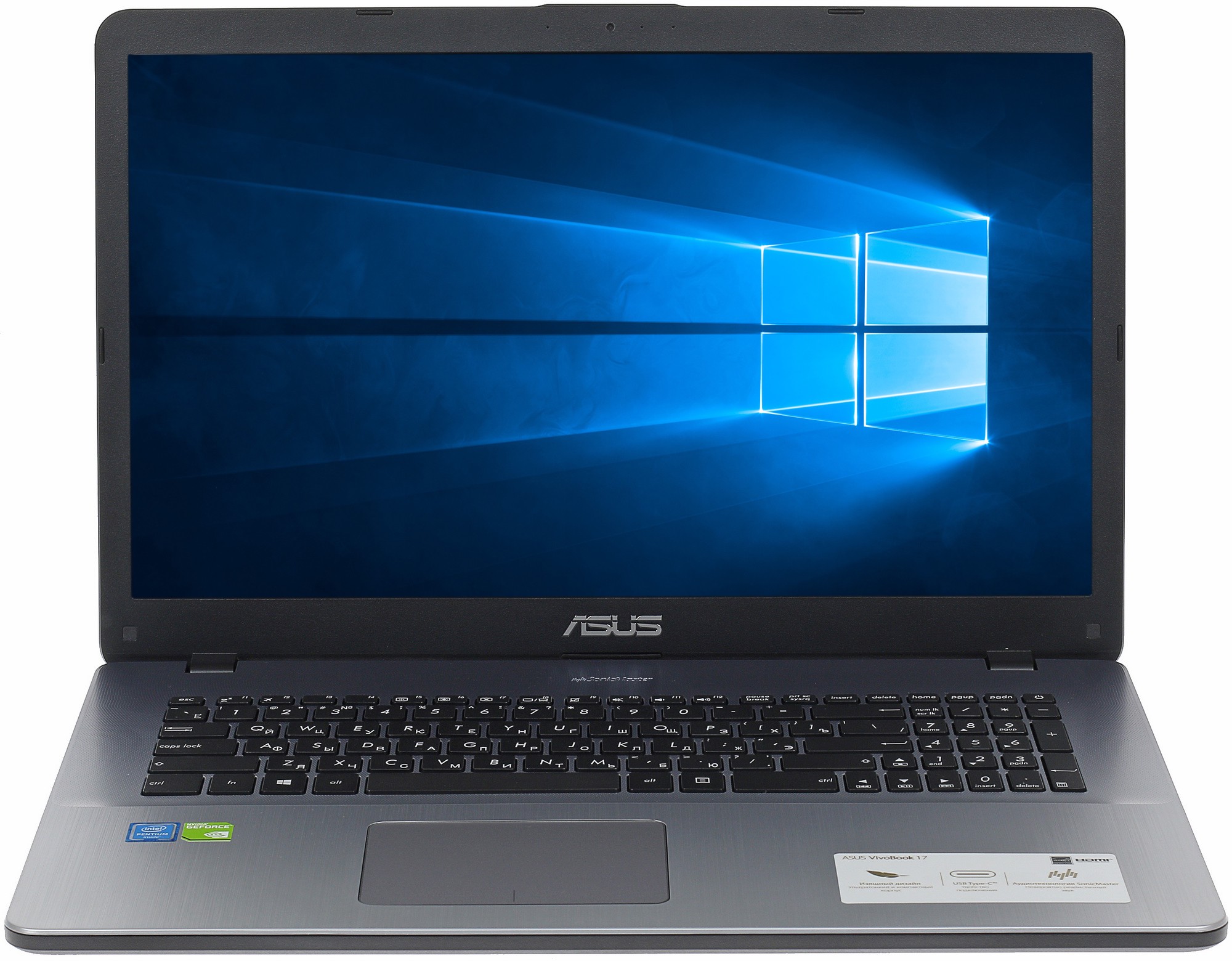 Ноутбук ASUS F705UB-BX268T в классическом темно-сером корпусе из пластика обладает матовым экраном диагональю 17.3 дюйма. В сочетании с разрешением 1600x900 пикселей, соответствующим формату HD+, и частотой обновления 60 Гц это делает его идеальным для работы, просмотра фильмов, серфинга в интернете. Двухъядерный процессор Intel Pentium 4405U в сочетании с оперативной памятью DDR4, а также видеокартами GeForce MX110 и Intel HD 510 лежит в основе функционирования модели