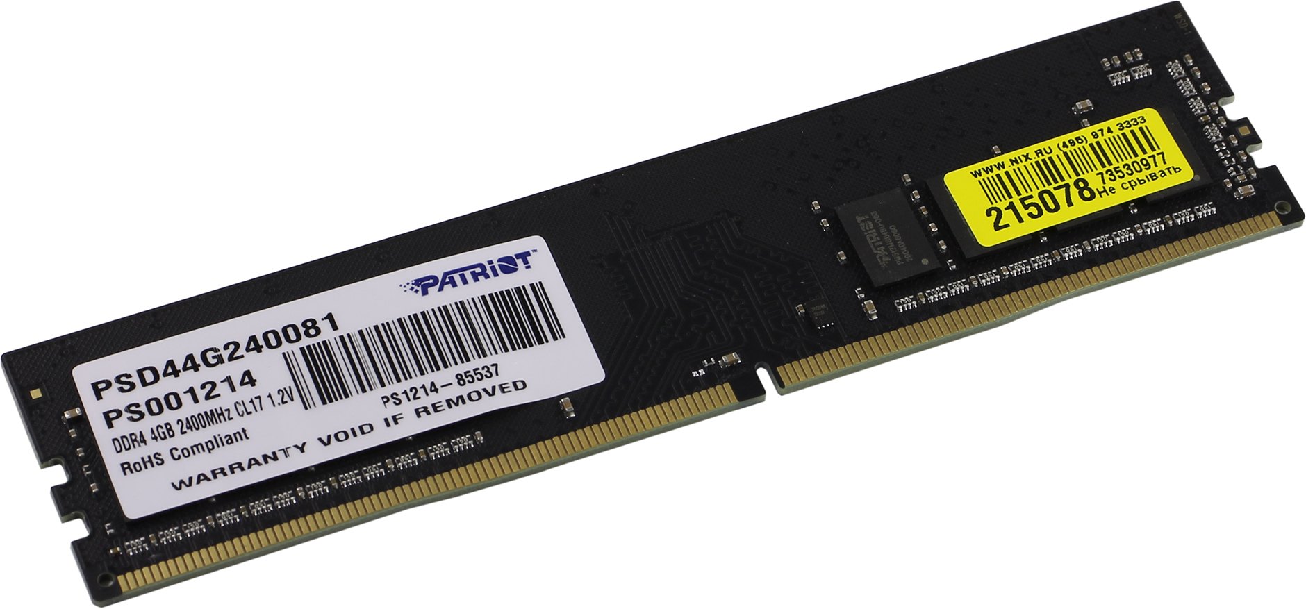 Оперативная память Patriot Signature [PSD44G240081] использует для питания напряжение, равное 1.2 В. Чипы памяти установлены с одной стороны модуля. Высота модуля памяти стандартна для такого класса устройств: она равна 31,25 мм. Информация о кратких технических характеристиках устройства расположена на наклейке, которая нанесена на чипы памяти. В качестве упаковки модуля памяти использован пластиковый мини-бокс, который надежно защищает память от повреждений в процесс