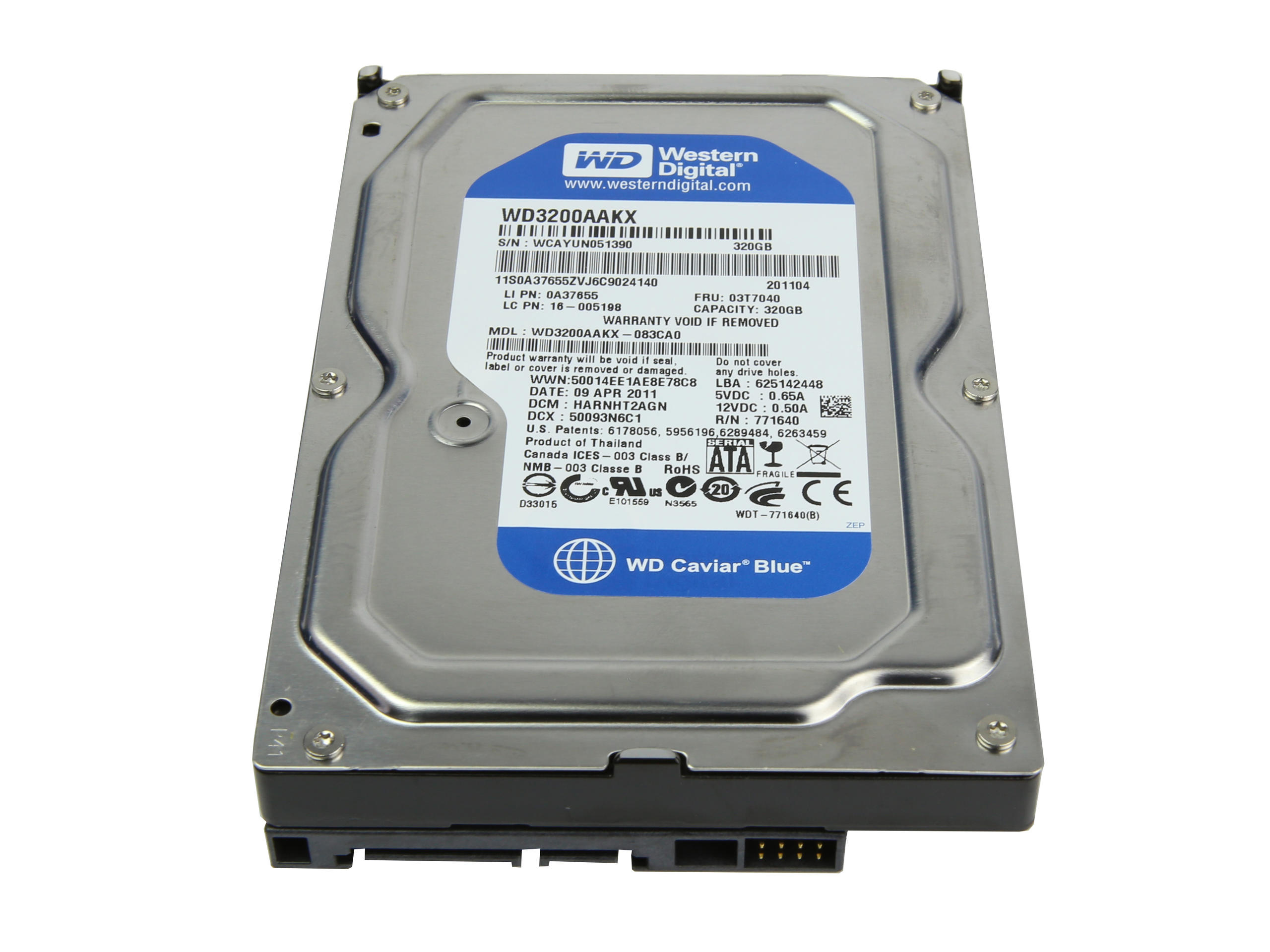 Жесткий диск Western Digital Caviar Blue 320GB (WD3200AAKX); Форм-фактор накопителя: 3.5"; Объем: 320 Гб; Скорость последовательного чтения: 126 Мб/с; Скорость последовательной записи: 126 Мб/с; Скорость вращения шпинделя: 7200 об/мин; Интерфейс передачи данных: SATA III
